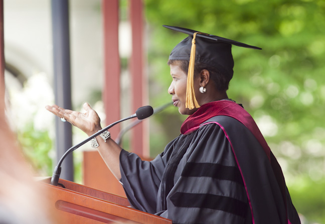 President Daniel H. Weiss conferred the honorary degrees upon Commencement speaker Gwendolyn L. Ifill, managing editor and moderator for Washington Week and senior correspondent for The NewsHour at PBS; Rev. Michael C. McFarland, S.J., president of College of the Holy Cross; Wilbur W. Oaks ’51, retired professor of medicine at Drexel University College of Medicine and founder of Saint John’s Hospice Homeless Soccer Team Program, Body and Soul; and Salvatore J. Panto Jr., mayor of the City of Easton. Edward W. Ahart ’69, chair of the Board of Trustees, presented Alkire with the Lafayette Medal.