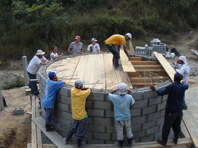 Students and villagers work on a 5,900-gallon water storage tank.
