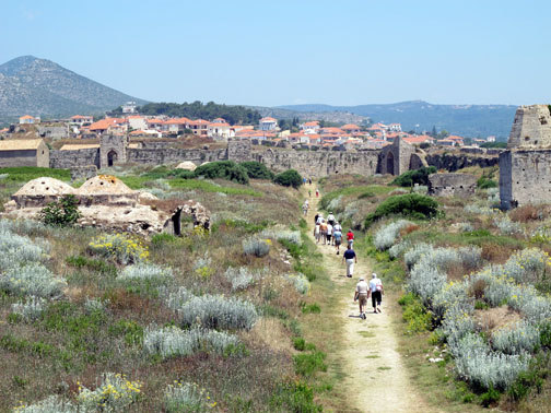 Travelers walk along a path near the village of Methoni, Greece.