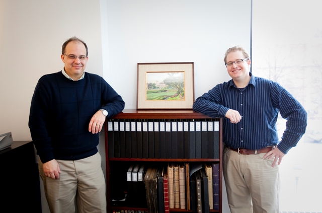 Paul Barclay, left, associate professor of history, and Eric Luhrs, digital initiatives librarian, pose in Special Collections with the Warner family postcard collection.