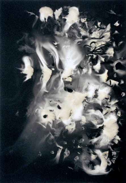 By allowing mushrooms to spore on paper, Toia captures a process that occurs daily but often goes unnoticed because it happens slowly and minimally in nature. In his work, he confines how far the spores can travel so that their masses pile up in a way that allows viewers to witness the process.