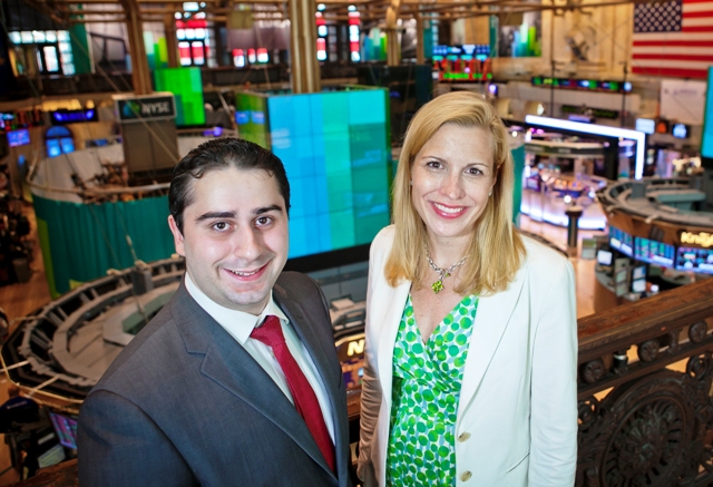 Nicholas Kalra ’13 and Janna Hodge ’94, senior vice president of sales and relationship management, in the members gallery overlooking the New York Stock Exchange.