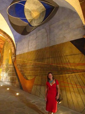 Chantal Pasquarello ’02 in front of a mural by David Siqueiros at la Escuela de Bellas Artes de Guanajuato in San Miguel de Allende.