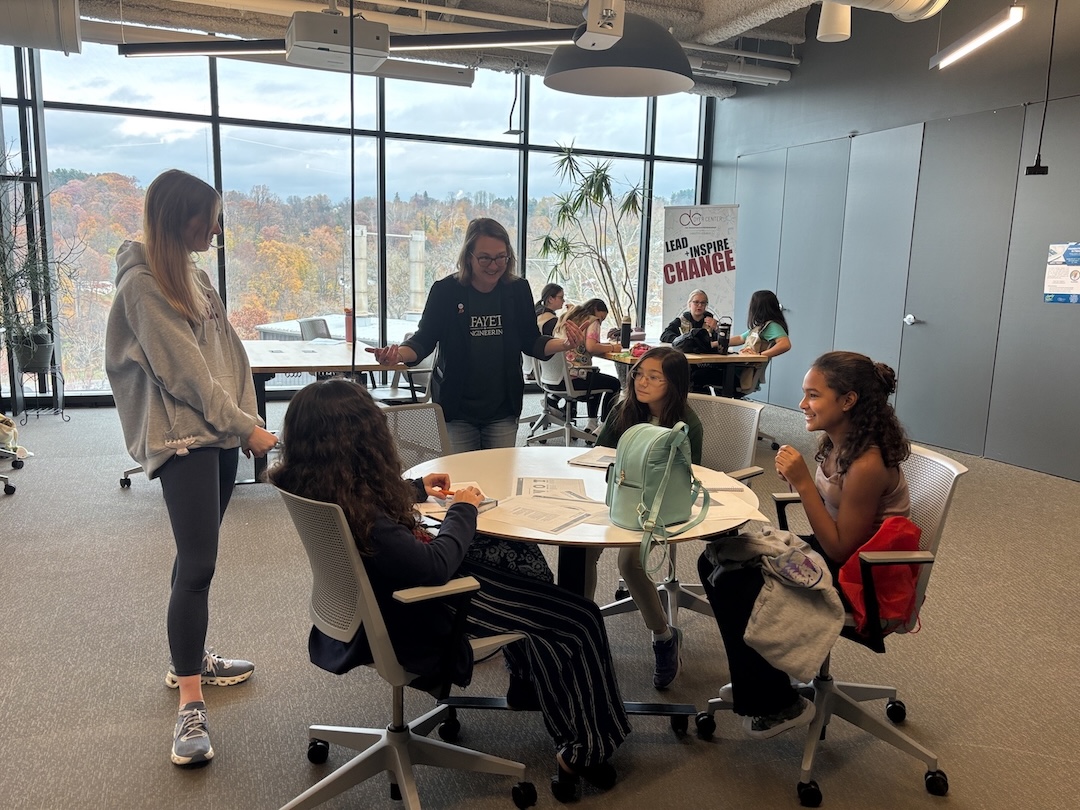 Girl Scouts and Lafayette students working on a project together in a classroom during Girl Scout Badge Day