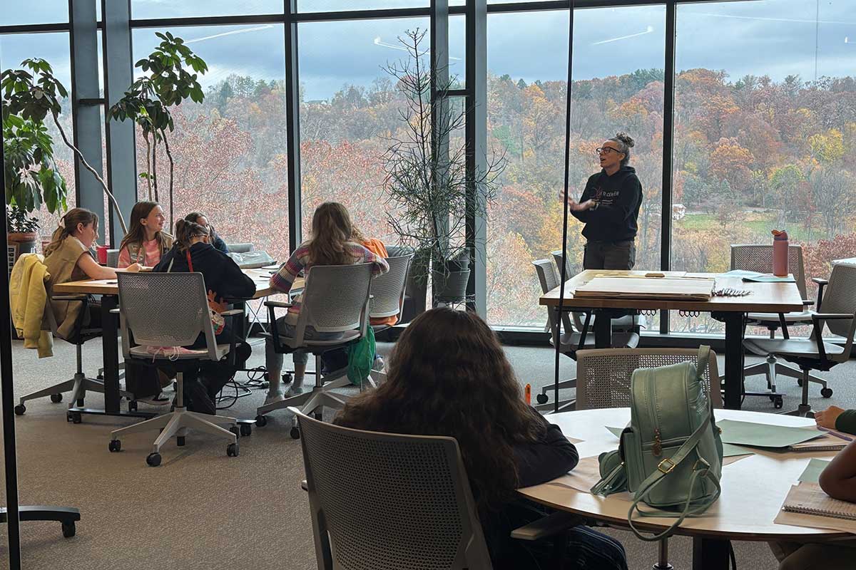 English major Claire Coker ’27 says she was excited to lead a session for the first time this year after volunteering at the inaugural Girl Scout Badge Day in spring 2025. “I loved volunteering last time, and I find it especially rewarding to work with children, so I was excited about this opportunity to get more involved,” says Coker, who guided a Daisy troop through a drawing exercise to help them reflect on what it means to be a good neighbor.