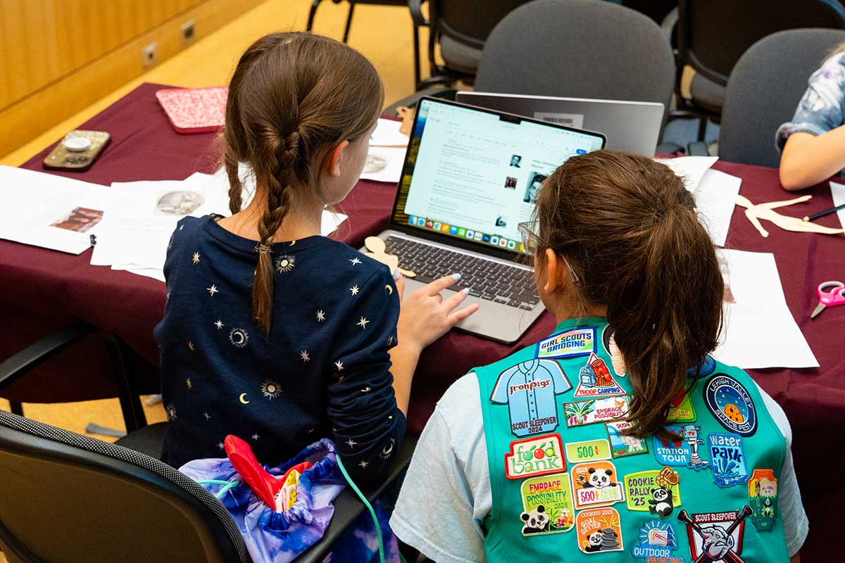 Lafayette volunteers planned and led interactive badge sessions held in Rockwell Integrated Sciences Center, Acopian Engineering Center, Williams Arts Center, and Skillman Library. During the sessions, Girl Scouts engaged in a variety of interactive projects like coding, building robots and Mars rovers, engineering fling fliers, learning about influential women in the College’s history, performing on a theater stage, and more. This year’s sessions, Fowler explains, included an even wider range of topics so returning troops could have a fresh experience and explore new areas of learning. “For our Lafayette volunteers,” she adds, “it was a chance to strengthen their connection to the local community while practicing leadership and mentorship in a hands-on way.”