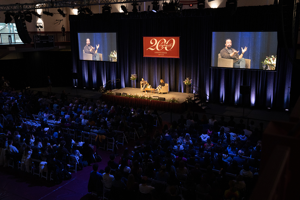 Speaking to an energized Kamine Gymnasium on Lafayette College’s campus, the composer, lyricist, and original star of the Broadway show Hamilton proved that he knows how to engage a crowd. Miranda’s discussion with President Nicole Hurd was punctuated by cheers from the audience as he mentioned everything from funding for the arts to the power of seeing Puerto Rico represented on a global stage.